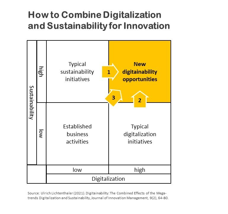 The term ‘digitainability’ has recently been coined in the academic literature to highlight relevant interdependencies between digitalization on the one hand and sustainability on the other. Actually, it does not really matter whether this specific term is used or whether companies refer to digital sustainability or sustainable digitalization instead. Much more important is the general awareness of interdependencies between these two megatrends. The variety of potential positive and negative interactions is addressed in my article entitled ‘Digitainability: The Combined Effects of the Megatrends Digitalization and Sustainability’, which has recently been published in the Journal of Innovation Management. The full text of the article