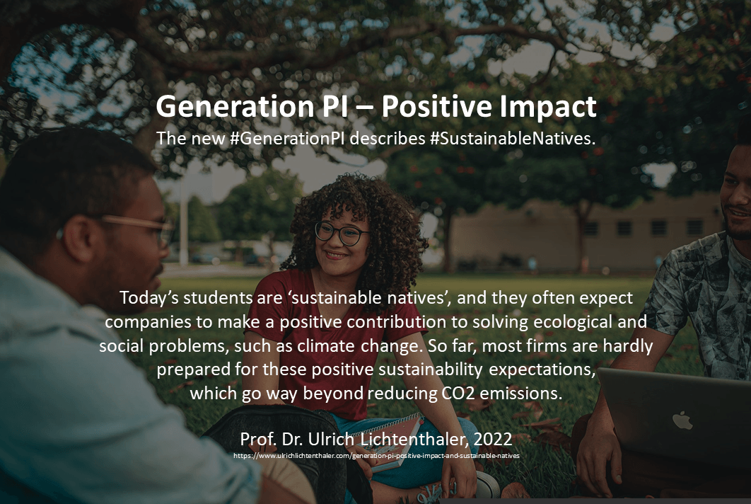 So far, however, many companies are hardly prepared for the future changes due to the ideas of those persons that will be starting their careers in the next few years. In fact, this new generation of ‘sustainable natives’ presents new challenges and opportunities for companies (as I have explained in more detail in a recent article in the Haufe Personalmagazin). In particular, the following typical perspectives of this ‘Generation PI’ – Positive Impact – have to be considered.