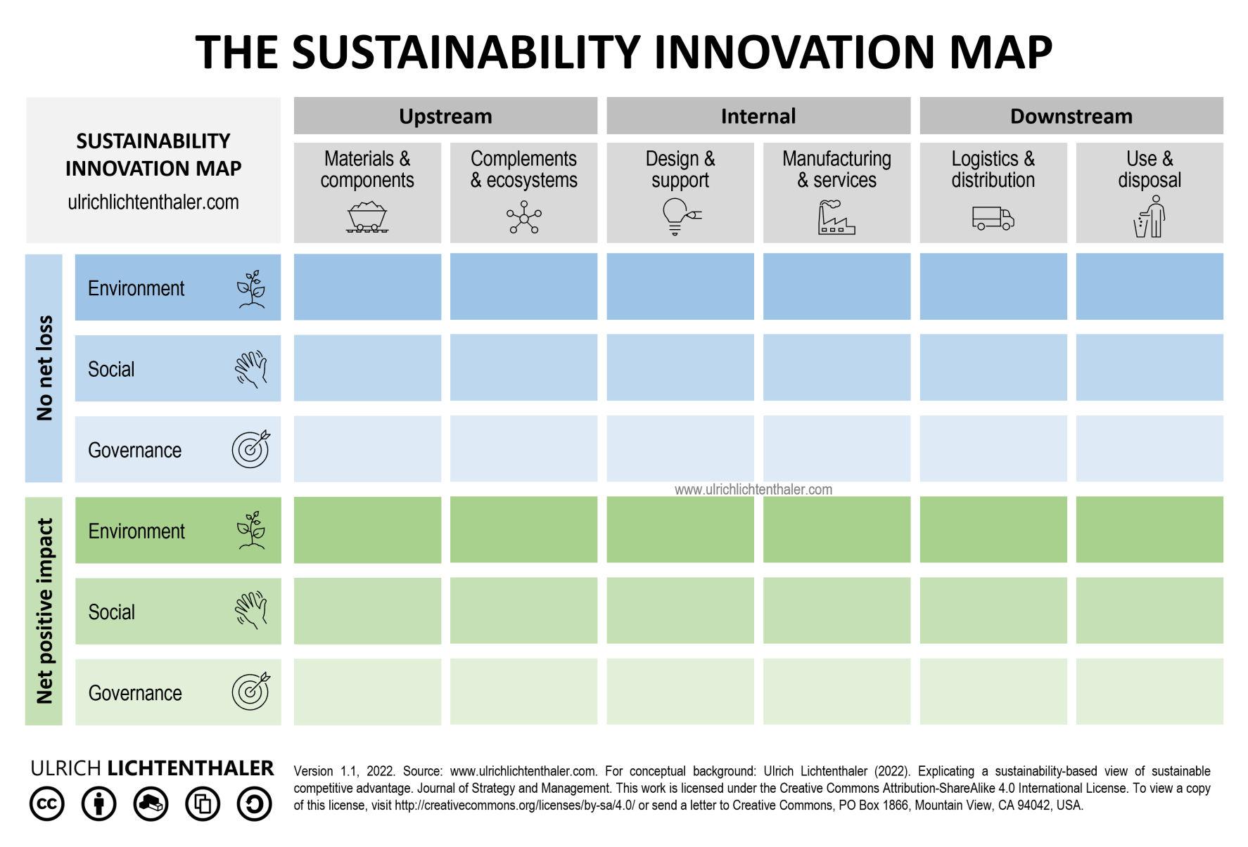 The SUSTAINABILITY INNOVATION MAP builds on insights from multiple company projects and prior research. For a conceptual background, please see: Ulrich Lichtenthaler (2022), Explicating a sustainability-based view of sustainable competitive advantage, Journal of Strategy and Management. The distinction of the 2 strategic directions has often been discussed in the sustainability literature, the 3 ESG dimensions are common since the triple bottom line, and at least some of the 6 supply chain stages have also been addressed in prior research.