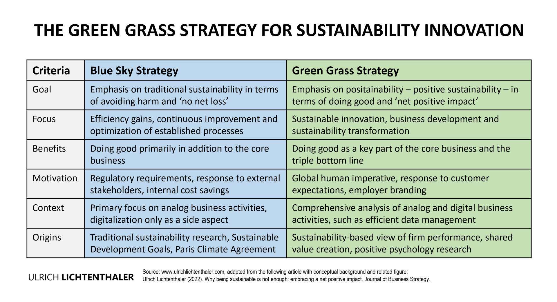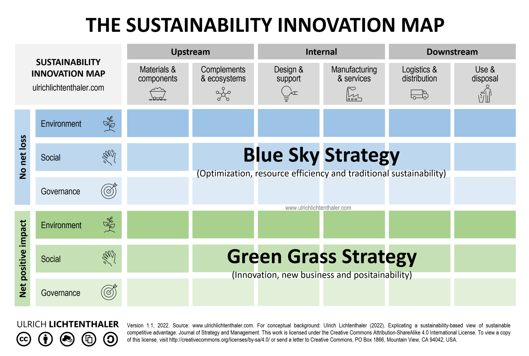 The GREEN GRASS STRATEGY draws on insights from multiple company projects and extant research in different fields, including SDGs, shared value creation, CSR, and positive psychology. For a conceptual background, please see: Ulrich Lichtenthaler (2022), Why being sustainable is not enough: Embracing a net positive impact, Journal of Business Strategy. The table above has been adapted from this article. For a free initial discussion and a free pdf template of the SUSTAINABILITY INNOVATION MAP (licensed under the Creative Commons Attribution-ShareAlike 4.0 International License), please contact me here.